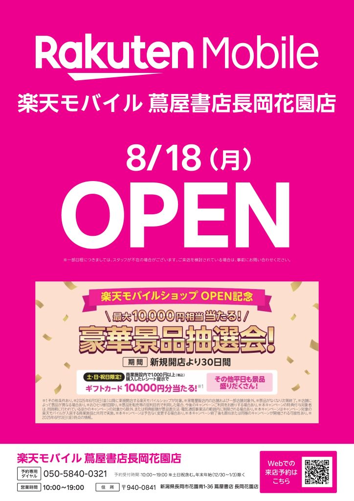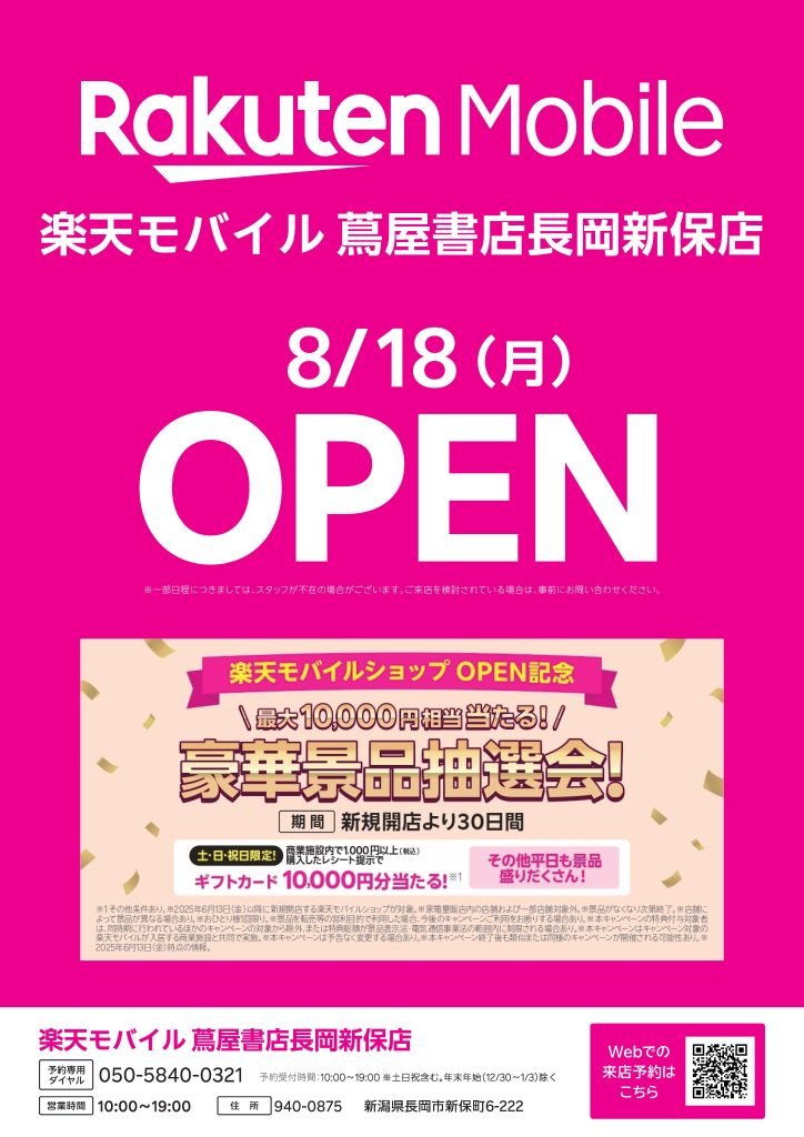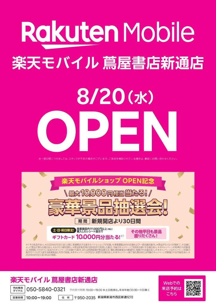 2025年8月20日(水) 蔦屋書店 新通店と新発田店 店内に、楽天モバイルがオープンいたしました。