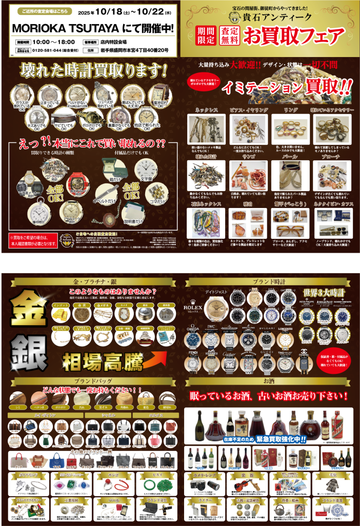 10月18日(土)~22日(水)、MORIOKA TSUTAYAにて宝石・ブランド品買取フェア開催!